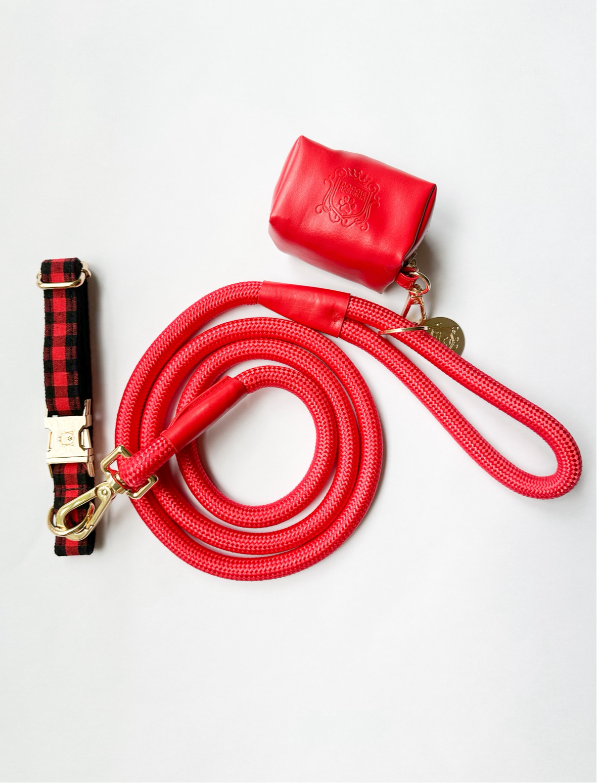 The Candy Apple Aspen Set is elegant enough for special occasions yet durable and comfortable for everyday adventures. Designed with premium materials, this set includes a collar, leash (Regular or Lite), and waste bag holder, making it the perfect all-in-one walking essential for your pup.